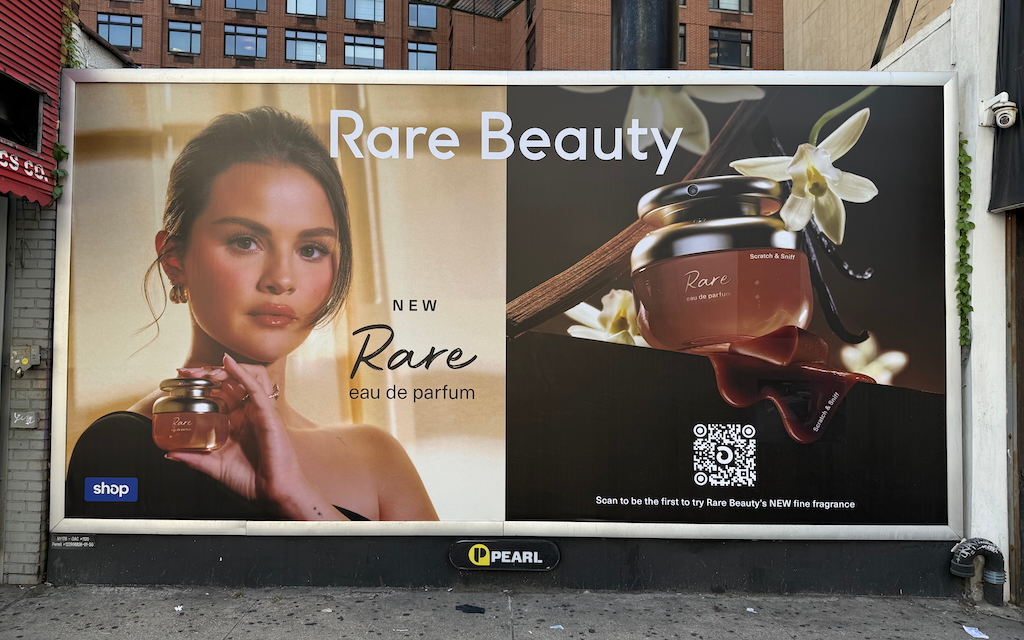 “Rare Beauty partners with Shopify’s Shop app on scratch-and-sniff OOH fragrance campaign.”